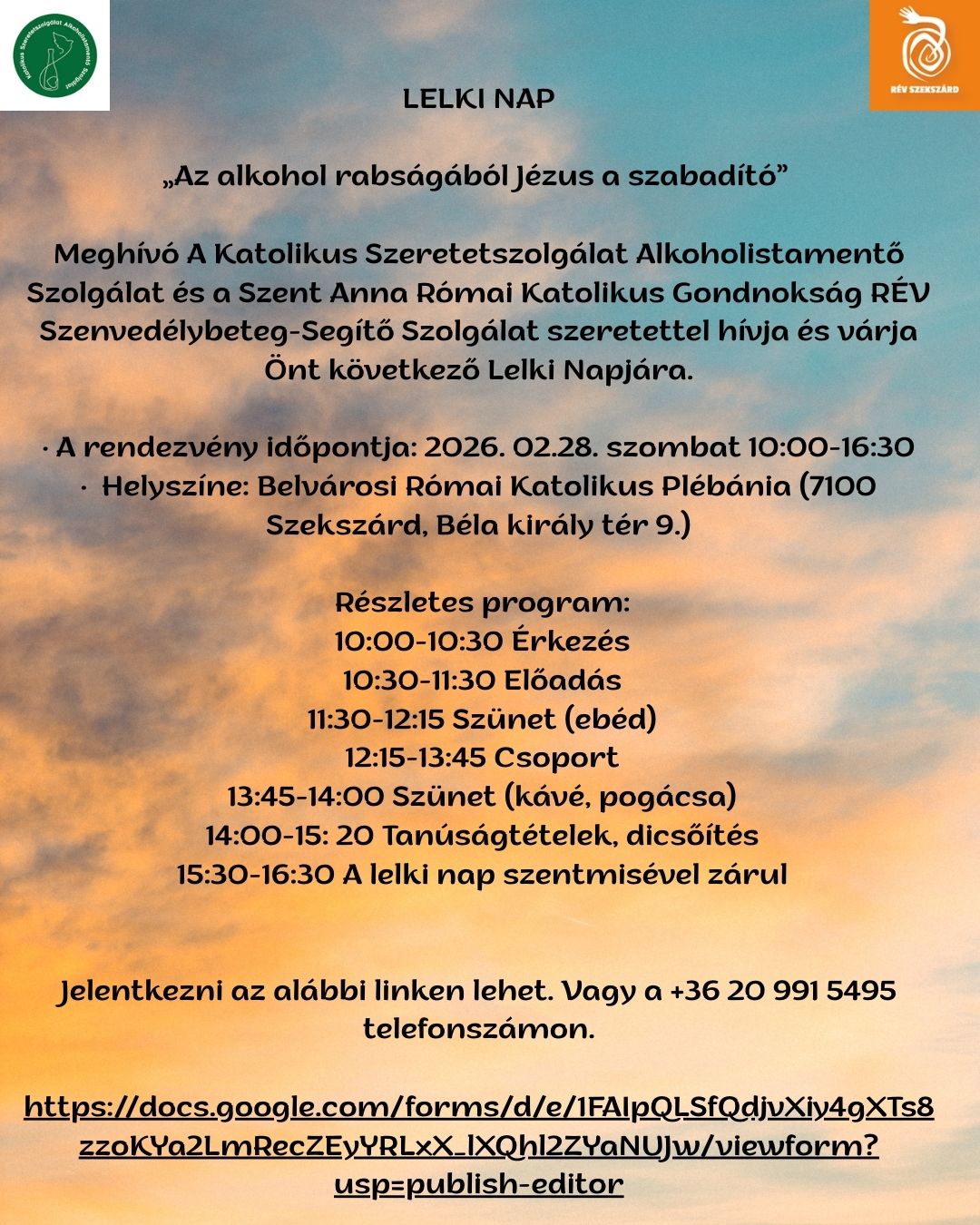 RÉV lelkinap lesz „Az alkohol rabságából Jézus a szabadító” címmel, február 28-án, szombaton, a plébánián 10 és 16 óra között. Részletes program ITT olvasható.