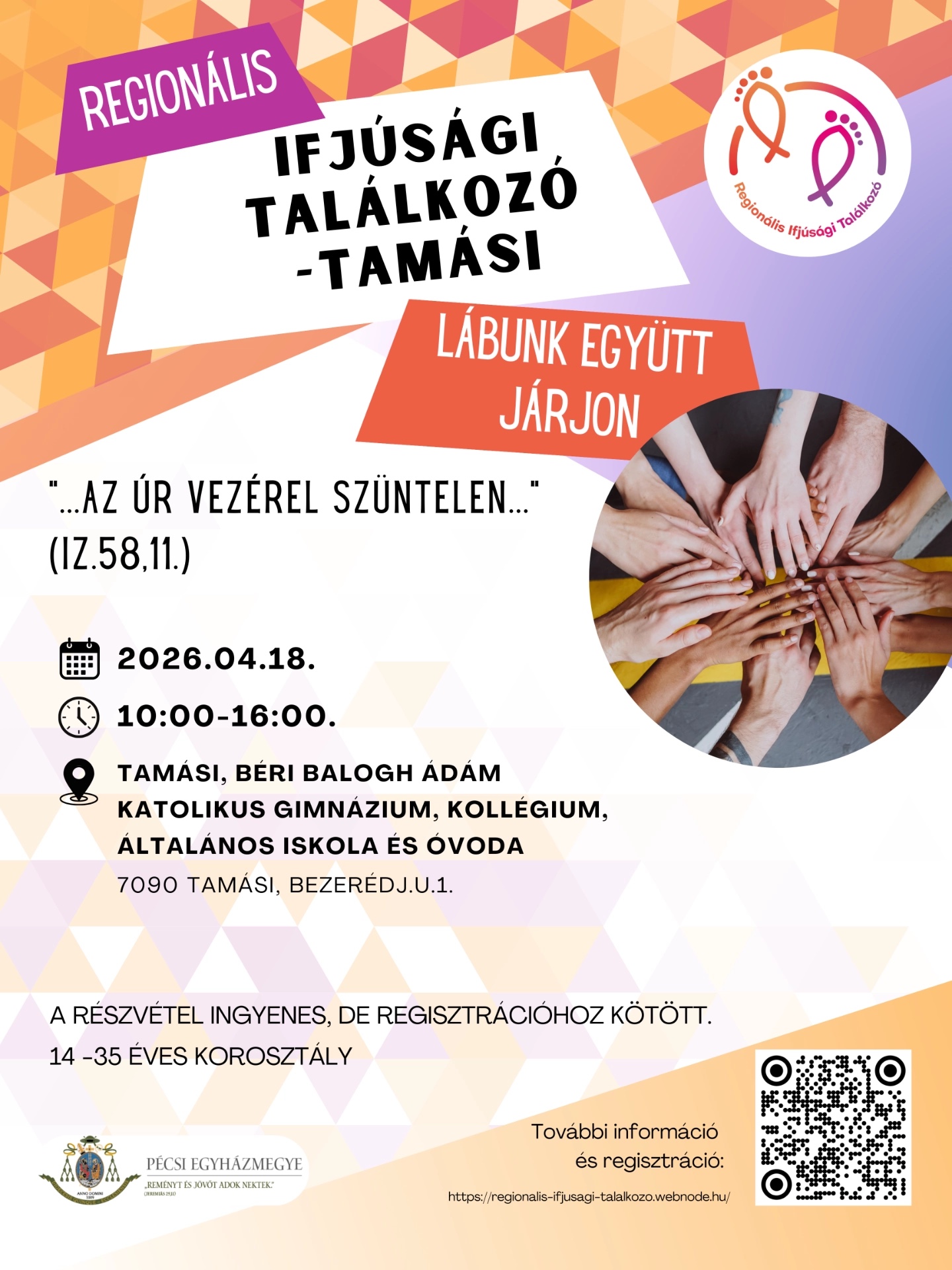 Regionális Ifjúsági találkozó lesz Tamásiban április 18-án (szombaton) 10-től 16 óráig, melyre szeretettel várják a 14-35 év közötti fiatalokat. Regisztrálni a Pécsi Egyházmegye honlapján keresztül lehet, részletek a plakáton olvashatók.